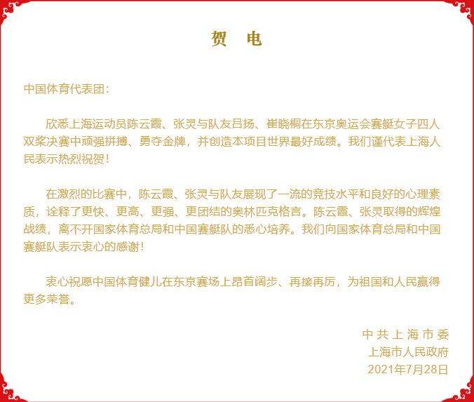 北京時(shí)間7月28日,上海市政府發(fā)賀電祝賀上海運(yùn)動員陳云霞、張靈與隊(duì)友呂揚(yáng)、崔曉桐在東京奧運(yùn)會賽艇女子四人雙槳決賽中勇奪金牌,以下為賀電全文: