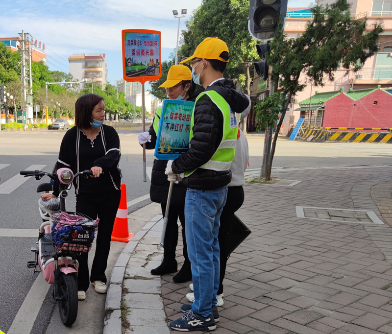 自全市啟動“頭盔風暴”行動以來,市公安局交警支隊南頭大隊開展了多種形式的宣傳教育活動,并取得一定效果,轄區(qū)摩托車、電動自行車駕乘人員頭盔佩戴率顯著提升,但是仍存在未佩戴安全頭盔等現(xiàn)象。為呼吁更多摩托車、電動自行車駕乘人員養(yǎng)成自覺佩戴頭盔的習慣,減少摩、電交通事故的發(fā)生, 11月1日起,市公安局交警支隊南頭大隊組織60余名交通勸導志愿者參與交通管理工作。志愿者于每日早晚出行高峰時間段,身穿熒光色志愿者馬甲,頭戴小黃帽,手舉勸導牌,堅守轄區(qū)30余個摩托車、電動自行車出行量較多的路口,勸導駕乘人員佩戴頭盔。