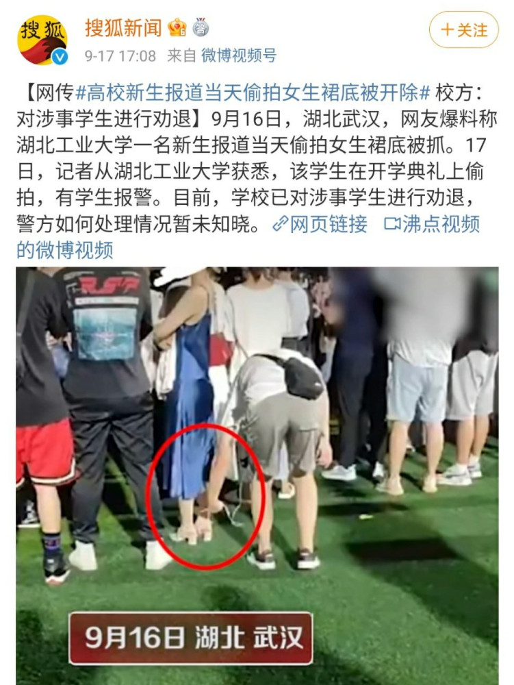 湖北工業(yè)大學的一位大一新生胡某,在開學報到后第二天晚上,在學校操場用手機偷拍女生裙底,被當場發(fā)現(xiàn)抓獲。根據(jù)湖北工業(yè)大學的通報,事發(fā)后這位新生和家長同意自動退學,在9月16日上午,也就是他入學報到的第三天,離開學校。