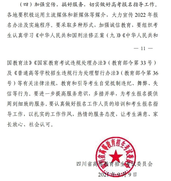 2021年9月14日,四川省高等教育招生考試委員分發(fā)布“關(guān)于做好我省2022年普通高考報名工作的通知”,就2022年統(tǒng)考、高考事宜進(jìn)行了說明。詳情如下: