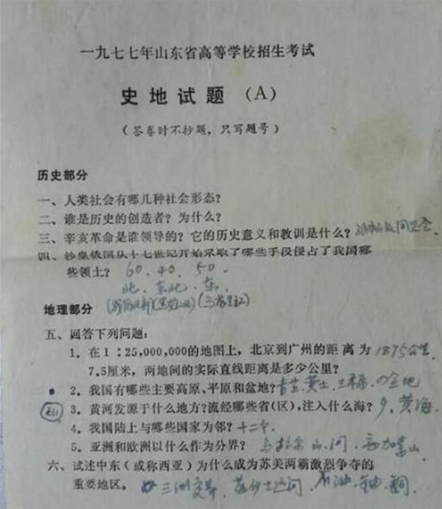 最后我們?cè)賮?lái)看一下歷史和地理試卷,1977年山東省高考將這兩科放在一起考,兩科一共才占了一面紙,再一看題目,都是最基礎(chǔ)的知識(shí)點(diǎn),如果現(xiàn)在高考這么考,估計(jì)滿分的考生占比能超過(guò)一半。