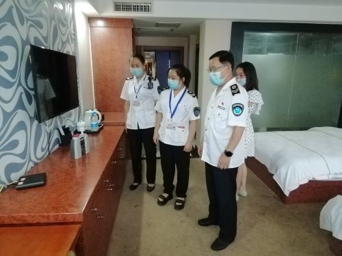 衛(wèi)生執(zhí)法人員在考生入住酒店查看衛(wèi)生防疫情況