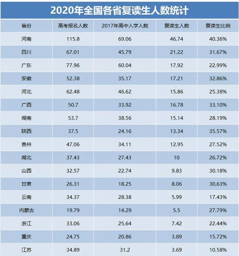 2、2020年,全國(guó)高考復(fù)讀生也達(dá)到了200多萬(wàn)人。據(jù)統(tǒng)計(jì),河南省高考復(fù)讀生最多,達(dá)到了46.74萬(wàn)人,復(fù)讀生比例是40.36%,相當(dāng)于許多省、市的高考報(bào)名人數(shù)。