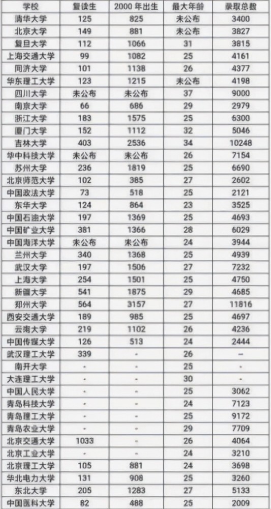 2021年,清華大學(xué)錄取了125名高考復(fù)讀生,占比是3.29%。北京大學(xué)錄取了149名高考復(fù)讀生,占比約為5.32%。復(fù)旦大學(xué)、上海交通大學(xué)、浙江大學(xué)、四川大學(xué)、同濟(jì)大學(xué)、南京大學(xué)、廈門大學(xué)、吉林大學(xué)等985工程大學(xué),都不同程度上錄取了高考復(fù)讀生。