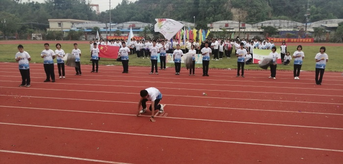本屆校運(yùn)會的進(jìn)場儀式在激昂的《運(yùn)動員進(jìn)行曲》中拉開序幕,最先入場的是國旗隊(duì)、校旗隊(duì)、校訓(xùn)隊(duì),朝氣蓬勃的紅旗方隊(duì),旗手們昂首闊步,高舉飄揚(yáng)的旗幟進(jìn)入會場。鮮花隊(duì)、彩旗隊(duì)緊隨其后,激情洋溢、活力四射。接下來各班的運(yùn)動員方隊(duì)在班主任的帶領(lǐng)下,邁著矯健的步伐、喊著響亮的口號,精神飽滿的接受校領(lǐng)導(dǎo)們的檢閱。主席臺前,他們用豐富多彩又極具創(chuàng)意的歌舞、隊(duì)形、口號展現(xiàn)班級良好的精神風(fēng)貌。最后出場的是意氣風(fēng)發(fā)的教師裁判方隊(duì),他們微笑著向會場揮手致意,全場立刻響起熱烈的掌聲。