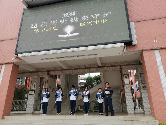 在紀(jì)念活動(dòng)的第二部分,鄒老師介紹了南京大屠殺的概況,并重溫了國(guó)家設(shè)立南京大屠殺公祭日紀(jì)念活動(dòng)的相關(guān)視頻,悲壯的音樂(lè)、肅穆的畫面,讓全體師生仿佛重回到了83年前的南京,看到了河山被踐踏、同胞被屠殺。最后全體師生情悲意堅(jiān),握緊拳頭、抬起頭顱高聲齊誦公祭日的《和平宣言》?;顒?dòng)后,校長(zhǎng)吳劍文勉勵(lì)全體師生要銘記歷史傳承精神、勿忘國(guó)恥振興中華,要教師踐行立德樹(shù)人為人師表,要學(xué)生學(xué)好本領(lǐng)報(bào)效祖國(guó)。