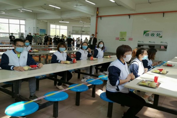 在“校門進(jìn)?!毖菥毉h(huán)節(jié),保潔人員(佩戴醫(yī)用口罩及手套)提前用規(guī)定消毒也對(duì)校門設(shè)施設(shè)備進(jìn)行擦拭消毒,并在消毒記錄本上做好登記。值日行政和校醫(yī)到崗檢查晨檢設(shè)施、消毒情況。學(xué)生進(jìn)校過程中,兩條隊(duì)伍行距2米、株距1米,有序排隊(duì),經(jīng)過測(cè)溫排除發(fā)熱后方可進(jìn)入校園。這一環(huán)節(jié)設(shè)置了“師生未佩戴口罩”、“學(xué)生發(fā)熱家長(zhǎng)接回”、“學(xué)生發(fā)熱校內(nèi)隔離”等應(yīng)急處置場(chǎng)景。在“教室突發(fā)”演練環(huán)節(jié),設(shè)置了“學(xué)生上課突發(fā)不適”、“教室內(nèi)嘔吐物現(xiàn)場(chǎng)處置”、“突發(fā)情況緊急撤離”、“疑似病例逐級(jí)上報(bào)”等應(yīng)急場(chǎng)景,讓全體參演人員現(xiàn)場(chǎng)學(xué)習(xí)規(guī)范的處理流程。在“食堂用餐”演練環(huán)節(jié),對(duì)“錯(cuò)峰用餐——餐前洗手消毒——有序取餐——安全用餐——餐具處置——餐后消毒”等各環(huán)節(jié)演練了工作流程和處置標(biāo)準(zhǔn)。在“宿舍應(yīng)急”演練環(huán)節(jié),對(duì)“保持安全距離——有序測(cè)溫進(jìn)宿舍——突發(fā)疑似病例緊急處置——突發(fā)情況逐級(jí)上報(bào)”等場(chǎng)景進(jìn)行了模擬。在“錯(cuò)峰放學(xué)”演練環(huán)節(jié),班主任在放學(xué)前對(duì)全體學(xué)生進(jìn)行測(cè)溫登記,年級(jí)有序安排放學(xué)順序,班主任及時(shí)上報(bào)當(dāng)日監(jiān)測(cè)數(shù)據(jù),校醫(yī)匯總情況逐級(jí)上報(bào)。