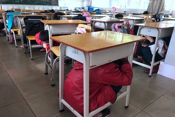 演練前,學(xué)校結(jié)合實(shí)際情況,認(rèn)真細(xì)致的制定活動方案,明確各部門職責(zé)要求。演練開始前,各人員迅速按照要求到達(dá)指定崗位,當(dāng)?shù)谝淮尉瘓舐曧懫饡r,師生模擬在課堂發(fā)生地震,學(xué)生用課桌及墻角作為掩體進(jìn)行躲藏。隨著第二次警報聲拉響,各班正、副班主任迅速指揮學(xué)生有序、快速撤離到學(xué)校操場的安全地帶,并迅速整理學(xué)生隊伍,清點(diǎn)、匯報人數(shù)。