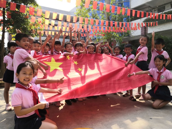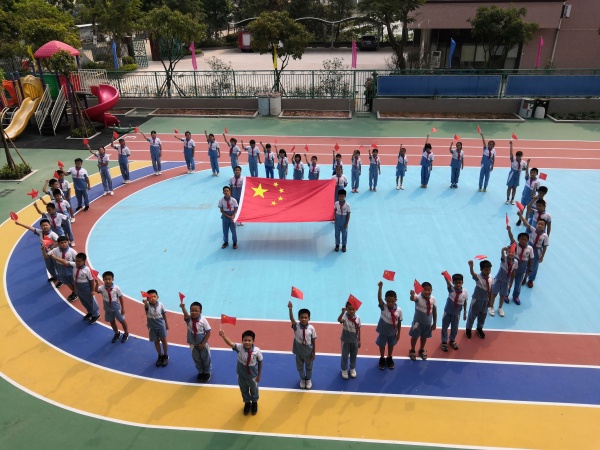 另外,各班還舉行了“飛揚的五星紅旗”擺拍活動,有的班級擺成愛心形,有的班級拿上國旗擺成70,還有的班級拿上小紅旗擺成圓形,同學們沉浸在愛國的喜慶當中,也得了一次很好的愛國主義體驗。