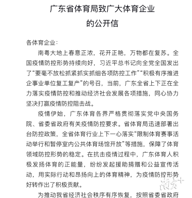“長風(fēng)破浪會有時,直掛云帆濟(jì)滄海。省體育局將與大家一道,積極應(yīng)對困難,把握發(fā)展良機(jī),催生新的活力。讓我們攜起手來,統(tǒng)籌推進(jìn)廣東體育產(chǎn)業(yè)高質(zhì)量發(fā)展”,公開信中寫道。