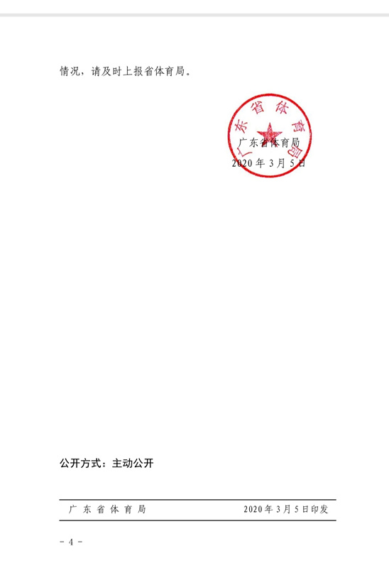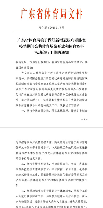 3月5日,廣東省體育局發(fā)布《廣東省體育局關(guān)于做好新型冠狀病毒肺炎疫情期間公共體育場館開放和體育賽事活動舉行工作的通知》(以下簡稱“通知”),按照“堅持分區(qū)分級防控,落實屬地管理”的要求,中風(fēng)險地區(qū)和低風(fēng)險地區(qū)根據(jù)屬地防控工作安排,有序推進公共體育場館開放和體育賽事活動舉行的恢復(fù)工作。