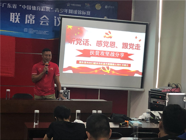 2020年8月23日上午,中共黨員、原東莞市對(duì)口幫扶韶關(guān)樂昌市黃圃鎮(zhèn)斗灣村駐村工作隊(duì)隊(duì)長(zhǎng)、2020年省青少年網(wǎng)球錦標(biāo)賽副裁判長(zhǎng)蘇敷志同志在賽區(qū)作了“精準(zhǔn)扶貧攻堅(jiān)戰(zhàn)分享”的主題宣講,全體裁判員及工作人員近70人參與活動(dòng)。