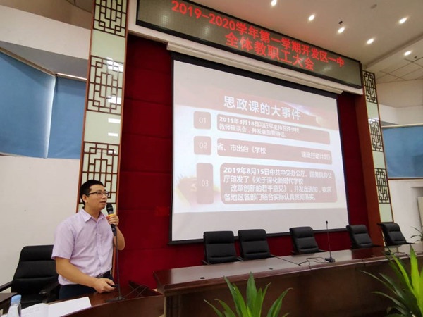 2019年9月1日上午,開(kāi)發(fā)區(qū)一中新學(xué)期工作部署會(huì)在階梯報(bào)告廳召開(kāi)。劉利民校長(zhǎng)在會(huì)上作了題為《黨員領(lǐng)頭,評(píng)估領(lǐng)先,積淀特色,不負(fù)人民》的講話(huà),本學(xué)期全體教師要按照“守初心,擔(dān)使命,找差距,抓落實(shí)”的總要求,推進(jìn)“不忘初心,牢記使命”主題教育,力爭(zhēng)理論學(xué)習(xí)有收獲,思想政治受洗禮,干事創(chuàng)業(yè)敢擔(dān)當(dāng),為民服務(wù)解難題,清正廉潔做表率。以黨建端正辦學(xué)思想,以黨建堅(jiān)定理想信念,以黨建鑄造職業(yè)精神。他希望老師們對(duì)照區(qū)公辦中小學(xué)年度實(shí)績(jī)考評(píng)體系,做好學(xué)校各項(xiàng)工作,嚴(yán)守師德“十不”底線(xiàn),做到教育不要傷害;要厚植自主文化,積淀辦學(xué)特色,立足學(xué)生高水平自治、自主導(dǎo)師群起、行政傳承創(chuàng)新、家委共治的現(xiàn)有良好態(tài)勢(shì),進(jìn)一步推動(dòng)全面培訓(xùn)、全面自評(píng),提升開(kāi)發(fā)自主動(dòng)力。他希望老師們珍惜人民的選擇,做有教育情懷的教師,讓開(kāi)發(fā)區(qū)一中永葆常青本色。