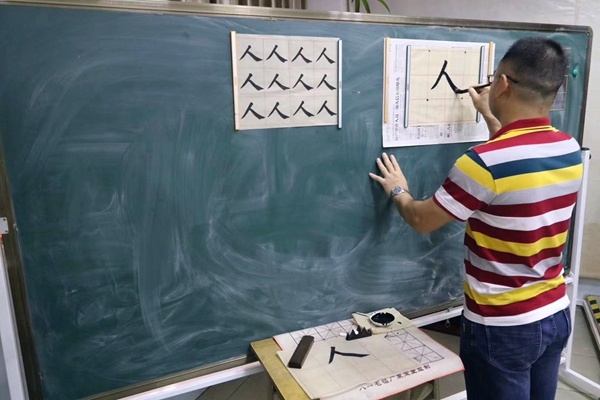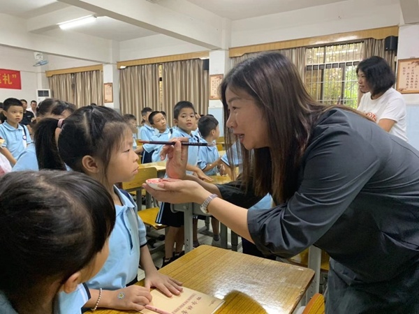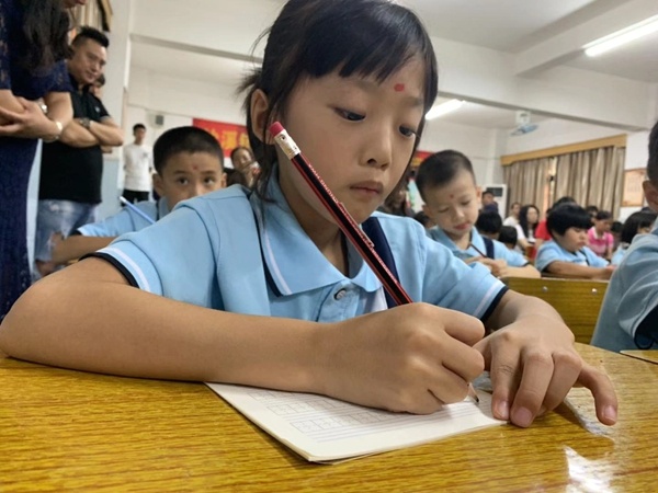 圣獅小學(xué)黃校長致辭后,開筆禮正式開始。孩子們?cè)谥鞒秩嗽捳Z的引導(dǎo)下,孩子們正衣冠、朱砂啟智、擊鼓鳴志、描紅“人”字、齊誦弟子規(guī)和孝親敬師。在自正衣冠環(huán)節(jié)中,孩子們知道了著裝要整潔。通過朱砂啟智環(huán)節(jié),孩子們得到了領(lǐng)導(dǎo)、老師和家長的祝福,通過點(diǎn)“痣”,開啟智慧,從此眼明心亮,好讀書,讀好書,讀書好。擊鼓鳴志環(huán)節(jié)中,黃校長擊的三聲鼓聲,聲音響且傳得遠(yuǎn),寓意著孩子們志向遠(yuǎn)大。第四環(huán)節(jié)是啟蒙描紅,黃解球老師分別用粉筆和毛筆示范書寫“人”字。孩子在開筆禮現(xiàn)場寫“人”字,寓意著在人生的啟蒙階段,要學(xué)會(huì)做人。隨后,一年級(jí)新生在丁老師的帶領(lǐng)下,齊誦弟子規(guī)的節(jié)選部分。最后,為傳承“孝、禮”好家風(fēng),發(fā)揮圣獅小學(xué)校園文化核心“傳承好家風(fēng)”的傳統(tǒng),孩子們?cè)谥鞒秩说囊龑?dǎo)下,向老師和父母行鞠躬禮,表示感恩。