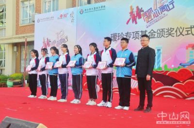 中山市工貿技工學校璦玲基金頒獎現場。圖為陳彥杏(右一)為優(yōu)秀學子頒發(fā)獎學金。