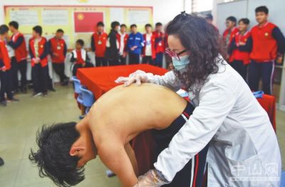 專業(yè)的篩查人員對學(xué)生的雙肩、雙肩胛骨、軀干雙側(cè)輪廓、骨盆的對稱性檢查及脊柱觸診,并進行Adam彎腰試驗檢查。一位剛從檢查室里出來的9年級學(xué)生說,這已是自己第3年接受脊柱健康篩查。學(xué)校負責(zé)人表示,篩查人員對檢查中發(fā)現(xiàn)學(xué)生脊柱疑似側(cè)彎的,都會進行登記并發(fā)書面通知給家長,建議帶孩子到市中小學(xué)衛(wèi)生保健所進行復(fù)診。學(xué)校近年為了學(xué)生的脊柱健康,也陸續(xù)更換了部分桌椅。采用可調(diào)節(jié)高低的新款式桌椅,方便了不同身高學(xué)生的使用,也為脊柱健康做好保障。