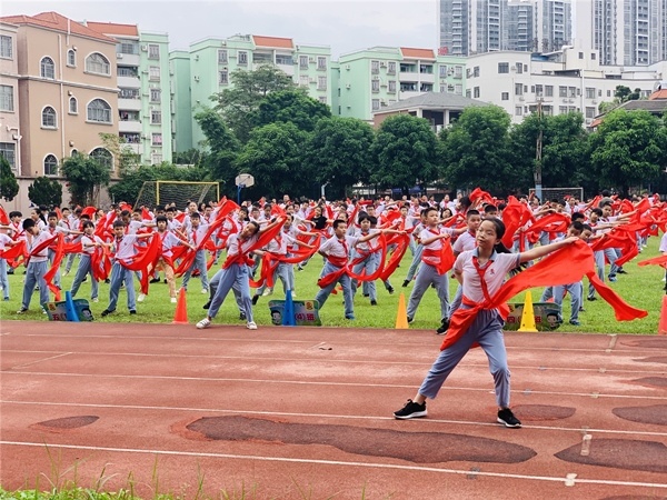 為了讓學(xué)生們進(jìn)一步地了解感受水滸人物的獨(dú)特魅力,增強(qiáng)自身身體素質(zhì),北區(qū)小學(xué)經(jīng)過(guò)研究討論,用《好漢歌》編排了一套活力滿滿,動(dòng)感十足的校本操,搭配著節(jié)奏感非常強(qiáng)烈的歌曲,學(xué)生跳起來(lái)動(dòng)感、精神。在動(dòng)感、豪爽的步子中舞起腰間的紅綢帶,顫步晃頭,扭腰抖肩。整體動(dòng)作爽朗風(fēng)趣、活潑大方。搭配上熱情豪邁的《好漢歌》,既能感受到水滸英雄的疏朗豪情,又能很好地鍛煉身體,每日大課間鈴聲響起時(shí),他們便會(huì)迫不及待地拿出屬于自己的紅綢帶,迅速地排好隊(duì)集中在操場(chǎng)上,跟隨著彭靜老師的口令學(xué)習(xí)集體舞動(dòng)作。驕陽(yáng)如火,孩子們手中的紅綢舞動(dòng)起來(lái),連成一片紅色的海洋。