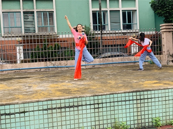 每個(gè)孩子的臉上都洋溢著燦爛的笑容,高年級(jí)的小朋友們學(xué)得快一些,動(dòng)作有模有樣,踩著鼓點(diǎn)變化著腳步,揚(yáng)起紅綢;低年級(jí)的弟弟妹妹們學(xué)得稍微慢一些,但跟著哥哥姐姐們搖擺著小手,跺著小腳,也是活力四射,精神滿滿。通過(guò)動(dòng)感的音樂(lè)、豪邁的舞蹈動(dòng)作,在舞蹈的過(guò)程中學(xué)生的全身心都沉浸在英雄好漢的豪邁情懷中,心中那份因疫情而沉寂的心情一下子被趕到九霄云外,因疫情而產(chǎn)生的小情緒都被動(dòng)感的節(jié)奏所感染,孩子們個(gè)個(gè)都笑起來(lái)、跳起來(lái)、舞起來(lái)!