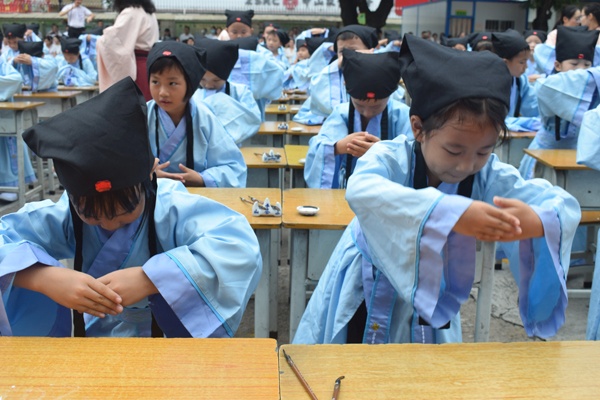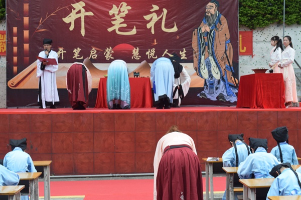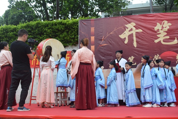 本次“開筆禮”儀式包括:正衣冠、禮拜先師、敬謝父母、敬拜師長、朱砂啟智、書字明理、擊鼓鳴志、經(jīng)典立志等多個環(huán)節(jié)。