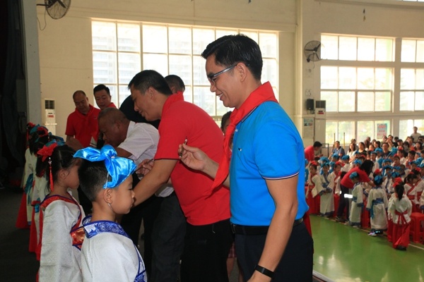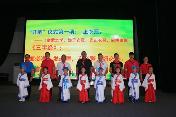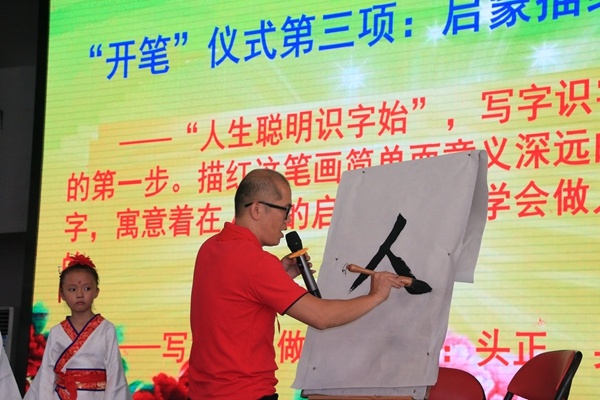 開筆破蒙禮 最美師生情 九月的陽光格外燦爛,九月的天空分外明媚,9月10日,在我國第35個教師節(jié)這個特殊的日子里,九洲基小學(xué)全體師生和一年級新生的家長歡聚在學(xué)校體育館,舉行了一年級開筆禮暨教師節(jié)慶祝活動。此次活動還邀請到小欖鎮(zhèn)教育事務(wù)指導(dǎo)中心副主任鄧永飛先生;九洲基社區(qū)黨委委員、居委會副主任伍枝發(fā)先生;九洲基社區(qū)黨委委員、治保會會主任李泳堅先生;九洲基小學(xué)家委會會長胡來輝先生;九洲基小學(xué)家委會副會長張宗剛先生以及九洲基小學(xué)校長艾斌先生。 在嘹亮的國歌聲中,鮮艷的五星紅旗映紅了一張張朝氣蓬勃的笑臉,隆重的一年級新生開筆禮正式舉行?!伴_筆禮破蒙儀式”是九洲基小學(xué)舉行的 “弘揚民族文化,傳承中華美德”的常規(guī)舉措,目的是使一年級新生以及全體同學(xué)們沐浴國學(xué)智慧,追尋文化根源,啟動人生第一件大事。 開筆禮的第一個環(huán)節(jié)是正衣冠。梁雪芬老師帶領(lǐng)全體同學(xué)齊聲誦讀《三字經(jīng)》片段:面必凈,發(fā)必理,衣必整,紐必結(jié)。頭容正,肩容平,胸容寬,背容直。九洲基小學(xué)行政以及領(lǐng)導(dǎo)嘉賓為學(xué)生代表整理服裝,一年級班主任和科任老師為學(xué)生整理服裝。 接下來開筆儀式第二項是朱砂啟智。朱砂啟痣,就是請領(lǐng)導(dǎo)、老師用紅色的朱砂在同學(xué)們的額頭正中點上紅痣,又稱“開天眼”。代表著開啟智慧,以此寄托美好的愿望。 第三環(huán)節(jié)是啟蒙描紅。王湛春老師現(xiàn)場示范一尺見方楷體“人”字。講解寫字要求做到八個字:頭正、身直、臂開、足安。各班代表拿筆、蘸墨,描寫出一個人字。由老師手把手地指導(dǎo)學(xué)生開筆。臺下其它同學(xué)在老師的指導(dǎo)下左手當(dāng)小黑板,右手食指當(dāng)筆進行書空。 第四環(huán)節(jié)贈書送禮。校領(lǐng)導(dǎo)為新生贈送該校自編的德育校本教材《好習(xí)慣伴我成長》,人手一冊。 接著學(xué)生代表講話和黃景鋒副校長寄語,希望一年級同學(xué)學(xué)習(xí)有個良好開端,希望全體同學(xué)新學(xué)期都更上一層樓。最后開筆禮在大家的掌聲中禮成! 活動第二環(huán)節(jié)是“最美師生情”教師節(jié)慶?;顒印W(xué)生們先通過觀看一段沙畫視頻,了解了老師們的良苦用心,接著師生同臺深情朗誦《感謝您,辛勤的園丁》,緊接著合唱團的一曲《每當(dāng)走過老師窗前》將慶祝活動推向高潮孩子們對老師的感激與愛戴之情都融入朗誦和歌聲中…… 學(xué)生代表為敬愛的老師獻上一束鮮花,道上一聲“節(jié)日快樂”,嬌艷的花瓣映襯著老師的笑臉,映襯著學(xué)生的微笑,人比花兒俏。 最后是代表發(fā)言。從學(xué)生代表發(fā)言中大家感受到學(xué)生對老師的愛,不僅在那嬌艷的鮮花里,更在認真守紀的課堂,響亮動聽的讀書聲,整潔漂亮的作業(yè)等實際行動中;從教師代表司徒詠老師的發(fā)言中大家感受到了九小年輕教師的成長離不開前輩們的關(guān)愛,離不開學(xué)生們的支持,更離不開老師自身的努力;從艾斌校長的發(fā)言中大家感受到了在學(xué)校尊重教育理念引領(lǐng)下,學(xué)生們健康快樂成長,老師們職業(yè)幸福感越來越濃,九洲基小學(xué)的發(fā)展蒸蒸日上!