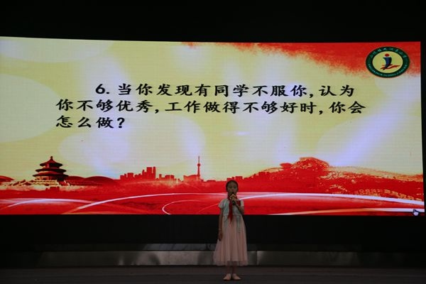《出旗曲》鏗鏘有力,鮮艷的隊(duì)旗,有力的步伐,奏響了活動(dòng)的序幕。經(jīng)過班級(jí)中隊(duì)選拔出來的15名隊(duì)員,從自己的性格特點(diǎn),興趣愛好、曾經(jīng)獲得的成績,以及自己在班級(jí)管理、對(duì)競選成功后的設(shè)想進(jìn)行了介紹?,F(xiàn)場答辯是最能體現(xiàn)選手水平的一環(huán)。此次的問題涉及少隊(duì)知識(shí),如“兒童幾歲可以入隊(duì)?幾歲離隊(duì)?”“你平時(shí)是如何愛護(hù)紅領(lǐng)巾的?” “我們隊(duì)的生日是哪天?在隊(duì)的生日,你想用什么來祝福隊(duì)的生日?”等;還有學(xué)生生活息息相關(guān)的問題,如“早上,同學(xué)們陸續(xù)回到教室,你怎么維持紀(jì)律,讓同學(xué)們自覺早讀?”“ 大隊(duì)部開展“一幫一”活動(dòng),你會(huì)從哪方面幫助學(xué)習(xí)上有困難的同學(xué),使他們各方面都得到提高?”各隊(duì)員的才藝也各具特色,武術(shù)、書法、舞蹈、跆拳道、獨(dú)唱、講故事、籃球充分展現(xiàn)三年級(jí)的素質(zhì)風(fēng)采。