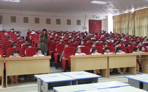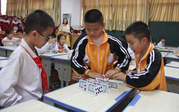 各參賽隊(duì)伍在了解比賽規(guī)則了之后,比賽就開(kāi)始了。一年級(jí)的小朋友們各施其技,搭出各種各樣形狀的紙牌,然后再小心翼翼地把書本放在搭好的紙牌上。但是有些隊(duì)伍在放書本的時(shí)候,不小心把搭好的紙牌推到了,必須要從頭再來(lái),可小朋友們也沒(méi)有氣餒,更是同心協(xié)力地繼續(xù)比賽。而看臺(tái)的同學(xué)則屏住呼吸,生怕發(fā)出一點(diǎn)點(diǎn)聲音就會(huì)讓賽場(chǎng)上的紙牌倒掉。比賽的最后,一(2)班的C組參賽隊(duì)伍以在紙牌上放上了18本書的成績(jī)勝出比賽。