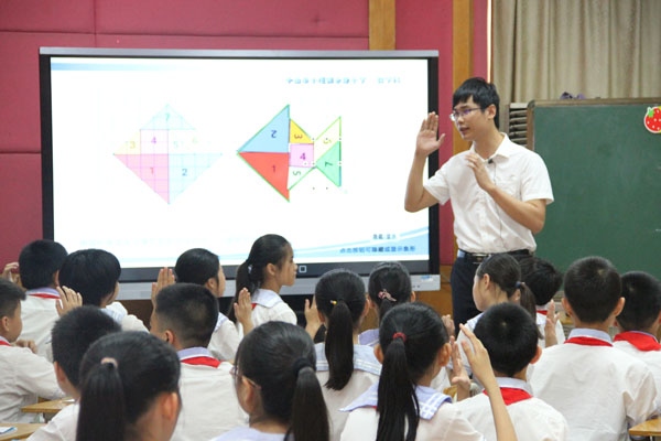 接著,由小欖鎮(zhèn)永康小學(xué)“智慧課堂”實(shí)驗(yàn)班的郭駿濤老師與五(5)班的孩子們呈現(xiàn)了一節(jié)精彩的信息技術(shù)助力的數(shù)學(xué)課——《玩轉(zhuǎn)七巧板》。整節(jié)課以“研學(xué)后教”理念為指導(dǎo)思想,在教學(xué)設(shè)計(jì)中大膽創(chuàng)新,充分發(fā)揮新媒體技術(shù)的優(yōu)勢(shì)作用在課前的學(xué)情調(diào)查、課中的助力、課后的鞏固。課前在線研學(xué)及時(shí)了解學(xué)生學(xué)習(xí)情況,并通過合作探究、作品共享等多種學(xué)習(xí)方式讓學(xué)生充分學(xué)習(xí)和感悟。課堂中,郭老師讓學(xué)生利用平板的錄屏等功能記錄圖形的運(yùn)動(dòng),并上傳和展示,體會(huì)到解決問題的多樣化,發(fā)展了學(xué)生的空間想象能力。課堂中,郭老師充分利用設(shè)備系統(tǒng)讓學(xué)生互相觀看、學(xué)習(xí)同學(xué)的作品,并進(jìn)行點(diǎn)贊、點(diǎn)評(píng)等活動(dòng),充分調(diào)動(dòng)學(xué)生全情參與課堂,整節(jié)課學(xué)生積極參與、樂趣無窮,既學(xué)習(xí)到了知識(shí),也收獲到了學(xué)習(xí)的快樂。課后永康小學(xué)的數(shù)學(xué)科組長(zhǎng)林瑜紅老師就從如何借助信息技術(shù)來及時(shí)了解學(xué)情,巧用學(xué)具,再現(xiàn)運(yùn)動(dòng)過程,達(dá)到發(fā)展學(xué)生空間觀念,培養(yǎng)學(xué)生的語言表達(dá)能力等方面簡(jiǎn)明扼要地介紹了此課的教學(xué)設(shè)想,得到與會(huì)領(lǐng)導(dǎo)、嘉賓、老師的一致贊同。