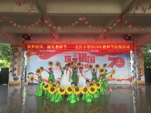 筑夢祖國,獻禮教師節(jié) “你給我一句話,就打開我一扇窗,你給我一個微笑我就渾身是力量……”,老師,從古至今都是一個受人稱贊的名詞,“春蠶到死絲方盡,蠟炬成灰淚始干”,老師,從古至今歌頌老師的詩句擲地有聲……在第35個教師節(jié)來臨之際,北區(qū)小學(xué)組織全校師生開展主題為“筑夢祖國,獻禮教師節(jié)”的教師節(jié)慶?;顒?。 9月10日的早晨,北小的校園是一片喜慶的海洋,經(jīng)過裝飾的大堂洋溢著濃濃的節(jié)日氣氛,全校師生手拿國旗揮舞著,北區(qū)小學(xué)慶祝教師節(jié)的活動好戲正在上演。活動由學(xué)校張雪老師和曾伯敖同學(xué)主持,劉云霄副校長代表學(xué)校向全體教師送上節(jié)日的問候和祝福;學(xué)生歌伴舞《老師》向老師表達敬意;師生朗誦《感念師恩》,師生間相互傾訴內(nèi)心獨白,老師們發(fā)出承諾,一日為師終身為師;主持人的采訪,學(xué)生向老師表達自己的敬意,“老師,謝謝您!”、“老師,我愛您!”、“我喜歡北區(qū)小學(xué)的老師”……一句句稚嫩的話語訴說著對老師的祝福;學(xué)校舞蹈隊舞蹈《阿藍與阿巫》,動感的音樂把會場的氣氛推上高潮;教師節(jié)日《旗袍秀》,平常雷厲風行的老師化身江南女子,婀娜多姿的身段贏得了學(xué)生的陣陣掌聲;學(xué)生代表手持獻花和小國旗,為全校老師送上獻花和節(jié)日的祝福,最后,全校師生一起唱響《我們都是追夢人》,校啦啦隊的隊員手持啦啦球從各個角落舞動起來,把活動氣氛再一次推上一個高潮。 老師,您是辛勤的園丁,盼望著鮮花滿園、桃李芬芳;老師,是美的耕耘者,是美的播種者,正是老師們用美的陽光普照、用美的雨露滋潤,才有綠草如茵、繁花似錦!在屬于教師的節(jié)日里,請收下學(xué)生的祝福和獻禮!
