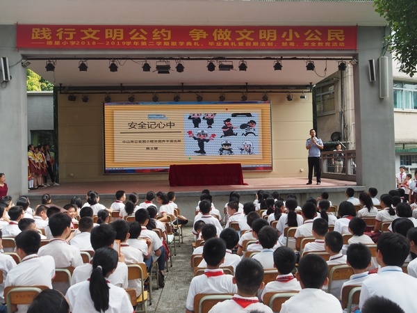 為大力培育和踐行社會主義核心價值觀,深化全國文明城市和文明校園創(chuàng)建,中山市教育和體育局在中小學(xué)生中組織開展《中山市民文明公約》宣傳教育實踐活動,通過“小手拉大手,文明齊步走”的方式,促使廣大市民對文明公約普遍認(rèn)知認(rèn)同,做到內(nèi)化于心、外化于行,進(jìn)一步提升社會文明程度。2019年7月5日德星小學(xué)開展了“踐行文明公約,爭做文明小公民”主題教育活動暨散學(xué)典禮、畢業(yè)典禮、假期法制、禁毒安全教育活動。