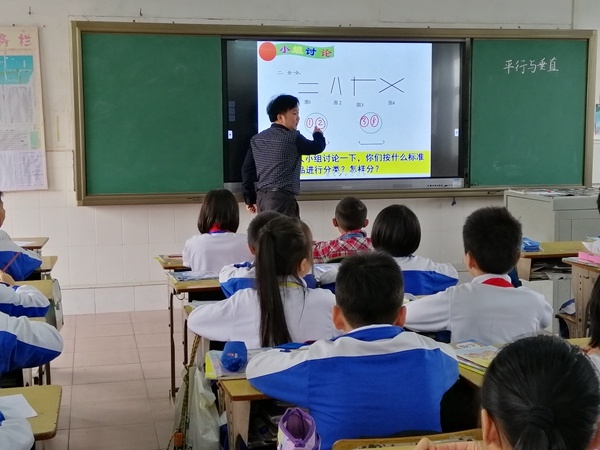 在教學(xué)平行與垂直時,劉主任能根據(jù)學(xué)生的思維特點,借助直觀圖形,充分讓學(xué)生動手操作,同伴互動獲取新知。學(xué)生積極主動參與,人人動手動腦,能過觀察、比較、討論,在輕松愉快的教學(xué)環(huán)境中很快認(rèn)識了兩條直線的位置關(guān)系,分出相交和不相交兩類,平行和垂直的定義。整節(jié)課教學(xué)思路清晰,重點突出,難點也得到了有效的突破,課堂教學(xué)效果好。