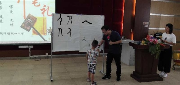 “咚!咚!咚!”,活動以三下洪亮的鼓聲拉開序幕。“朱砂啟智”環(huán)節(jié),由學(xué)校行政代表和班任老師用紅色的朱砂在學(xué)子們的額頭正中點上紅痣,并說上祝福的話語?!爸焐皢⒅恰庇址Q“開天眼”?!梆搿蓖ā爸恰?,意為開啟智慧,以此寄托美好的愿望,從此眼明心亮。接著,中國書法協(xié)會會員謝老師飽含熱情地指導(dǎo)孩子們書寫“人”字,希望孩子們在人生的啟蒙階段學(xué)會做人,知道做人首先要堂堂正正地立身,腳踏實地做事,要像“人”字那樣頂天立地?!百浌P寄語”環(huán)節(jié)上,蔡校長熱情洋溢發(fā)表寄語,希望學(xué)子們尊師孝親、博愛樂學(xué),親圣賢、親師長、成為博學(xué)、健美、善思的好少年。緊接著,在集體誦讀弟子規(guī)環(huán)節(jié)中,稚嫩的童聲響徹活動現(xiàn)場。在學(xué)生代表擊響大鼓后,孩子們都默默地在心中說出了自己的理想和志向。