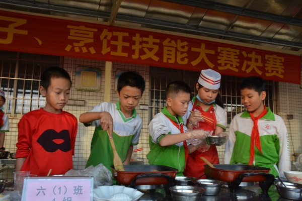 廚藝大賽由五、六年級的全體師生參加,先在班級里進行初賽,然后每班選出兩隊代表,每個隊伍4人。學校為參賽選手準備每班2臺電炒鍋,基本調(diào)料,參賽選手們在30分鐘內(nèi),完成規(guī)定的兩道菜肴:青瓜炒肉和紫菜蛋花湯各一份,并為每個菜寫上菜名,12組選手同時進行。主持人朱小惠老師宣布比賽正式開始后,選手們穿戴好廚師衣帽,團結(jié)合作,大顯身手,忙的不亦樂乎。觀眾們看得興致勃勃,簡單的菜肴形象的考查了選手們的基本功。在規(guī)定時間內(nèi),各小組都捧出了精心制作的色香味俱全的菜肴,現(xiàn)場彌漫著誘人的香味,各位評委和觀眾們都迫不及待的想去品嘗這些菜肴。