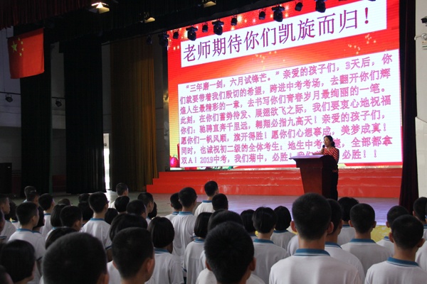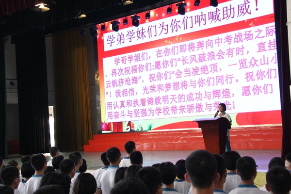 接著,繼初一學(xué)生代表萬冰冰同學(xué)為學(xué)長們獻上熱誠祝福后,初二、初三考生分別在雷毅、陸治君同學(xué)的帶領(lǐng)下,先后重溫了中考誓言。鏗鏘的誓詞,令人心潮澎湃,斗志昂揚!