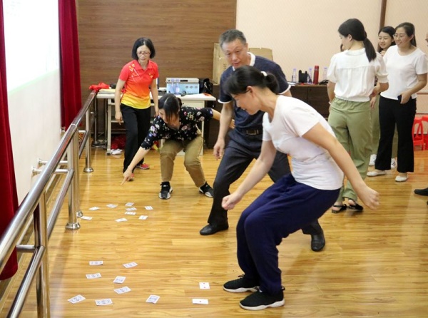 團康活動一開始,陳云炫老師指導40多位參與的老師圍成一個大圓圈,讓大家來了一場“大風吹小風吹”的熱身活動,熱身活動中大家反應敏捷動作迅速,在歡聲笑語中很快融入了活動氛圍。心理老師還為大家準備了小禮品“減壓小貼士”,在“生日蛋糕”的活動中老師們感觸很深,每位老師不分彼此,心連著心,真誠地為對方捶捶背,揉揉肩,拍拍后腦勺鼓勵下對方。在“為你打call”環(huán)節(jié)中,老師們根據自己所報的數字分成了四組,老師們在規(guī)定的時間內為自己的小組取了別致又幽默的名字和口號:陳清茂校長、鐘斌等老師所在的第一組為“天地壹號”組,楊青華副校長、楊建雄老師、楊理明老師等第二小組為“三楊開泰”組,許欽華、黃慧芳等第三組老師為“山竹與榴蓮”組,劉偉、李濤老師帶領的第四小組為“美女與野獸”組。在“撲克牌”游戲中每個小組的成員在討論的過程中匯聚智慧,為小組獻計獻策,出心出力,團結友愛,和睦溫馨的畫面映入眼簾,為家園永中、美麗永中點贊!