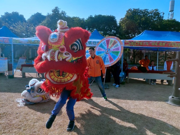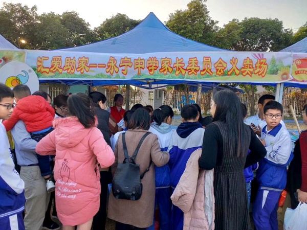 不過(guò),讓學(xué)生們最開(kāi)心的還是在運(yùn)動(dòng)場(chǎng)上舉行的第九屆永中公益銀行公益嘉年華活動(dòng)。演出一結(jié)束,同學(xué)們就興高采烈、爭(zhēng)先恐后的涌向?qū)W校運(yùn)動(dòng)場(chǎng)。在跑道周?chē)惲兄俺跻簧菩幸孜锝帧?、“初二舌尖上的永中”、“初三益智游戲一條街”、“家委會(huì)義賣(mài)區(qū)”、“時(shí)光信箱”、青年之家·學(xué)習(xí)社、永中公益銀行知識(shí)大轉(zhuǎn)盤(pán)、永寧社區(qū)禁毒公益互動(dòng)區(qū)、E2·綠地球環(huán)保體驗(yàn)區(qū)、English corner攤位、《獅樂(lè)萬(wàn)家》之”非遺~醒獅”公益體驗(yàn)區(qū)、鄰舍衣物回收攤位、衛(wèi)愛(ài)行動(dòng)(由小欖鎮(zhèn)民強(qiáng)“普洱”茶莊提供義賣(mài)物品,所有義賣(mài)善款全額資助永寧中學(xué)初二3班梁**同學(xué))等40多個(gè)攤位。同學(xué)們個(gè)個(gè)高舉著永中公益銀行存折,做起公益活動(dòng),玩起心愛(ài)的游戲、互換心愛(ài)物品、購(gòu)買(mǎi)心愛(ài)的義賣(mài)物品捐獻(xiàn)自己的愛(ài)心。體現(xiàn)了“善行換積分,積分換歡樂(lè)”的志愿精神。、
