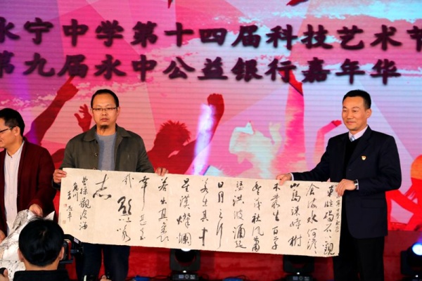 下午3:00,永寧中學(xué)第十四屆科技藝術(shù)節(jié)開(kāi)幕式在學(xué)校體育館舉行。小欖鎮(zhèn)文體教育局盧穎禧局長(zhǎng)和永寧中學(xué)陳清茂校長(zhǎng)分別為活動(dòng)致辭,衷心希望永中科技藝術(shù)節(jié)越辦越出色,教育教學(xué)成績(jī)年年有新喜報(bào)。李志平、陳永生、吳曉暾等書(shū)畫(huà)工作室大師們將現(xiàn)場(chǎng)潑墨揮毫的墨寶贈(zèng)送給永寧中學(xué),祝愿永中教育事業(yè)蒸蒸日上!