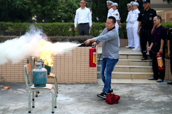 隨后,模擬學校出現(xiàn)火情,小欖鎮(zhèn)消防中隊消防車進入現(xiàn)場,實施撲救的現(xiàn)場實操。消防中隊官兵現(xiàn)場進行有關(guān)滅火器使用及滅火技能培訓,指導教職工、保安及學生模擬實操演練。