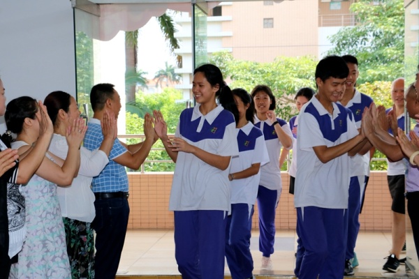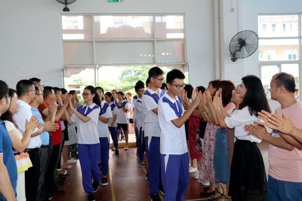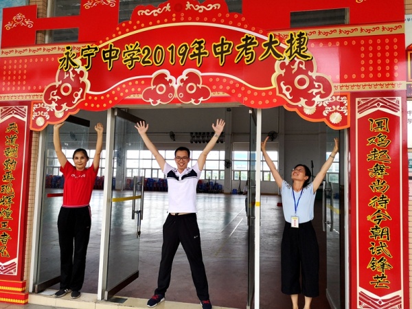 大會一開始,初三年級學生分班級依次走過精心設計的“永寧中學2019年中考大捷”的龍門,劉校長、文校長帶領全體行政、初三老師們及家長代表分列兩旁,和同學們擊掌,為他們加油祝福,場面真切感人。