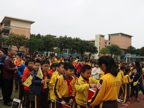 在升旗儀式上,五(1)中隊(duì)的旗手們從不同角度介紹了慈善萬(wàn)人行活動(dòng)。彭磊老師作了主題演講。接著,學(xué)校德育處行政做了動(dòng)員講話,充分介紹了今年中山市慈善萬(wàn)人行活動(dòng)。隨著公益主題曲《愛(ài)傳遞》等歌聲的響起,捐款開始了。少先隊(duì)員們揮舞著慈善愛(ài)心旗,操場(chǎng)上成了旗幟的海洋。