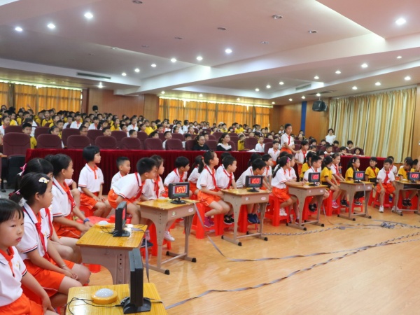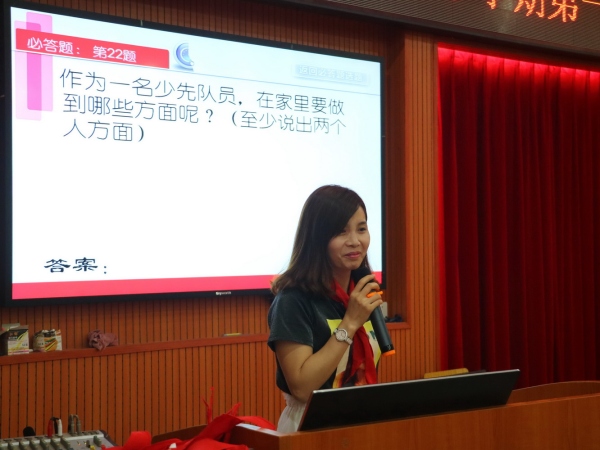 本次入隊培訓(xùn)以知識競賽的形式展開,由大隊副輔導(dǎo)員王甜老師和關(guān)永釧老師組織。競賽開始前,王甜老師帶領(lǐng)所有隊員和同學(xué)們邊唱隊歌邊做手語操。接著,各中隊少先隊員代表和預(yù)備隊員組成答題小隊。本次競賽分為必答題、搶答題和實操比賽題三個環(huán)節(jié)。必答題要求各隊先選擇題號,每隊必須答3題,答對加10分答錯或不答不扣分,觀眾可以補答。在第一輪的比賽中所有的隊伍抽中的題目全都答對,這也體現(xiàn)了隊員們對少先隊知識都比較了解。最激動人心的是搶答題環(huán)節(jié),這需要隊員們眼疾手快,通過這一環(huán)節(jié)的比拼,每一個小隊的分?jǐn)?shù)也拉開了差距。實操項目,要求參賽隊員在規(guī)定時間內(nèi)自己系好紅領(lǐng)巾,關(guān)永釧老師面對所有隊員和預(yù)備隊員們當(dāng)場演示正確系紅領(lǐng)巾的方法和敬標(biāo)準(zhǔn)隊禮的姿勢。在整個活動中各中隊隊員們和預(yù)備隊員們參與的積極性非常高。