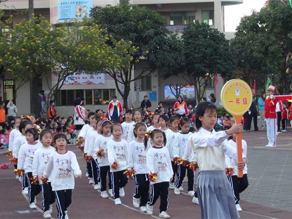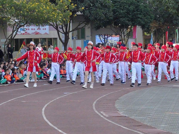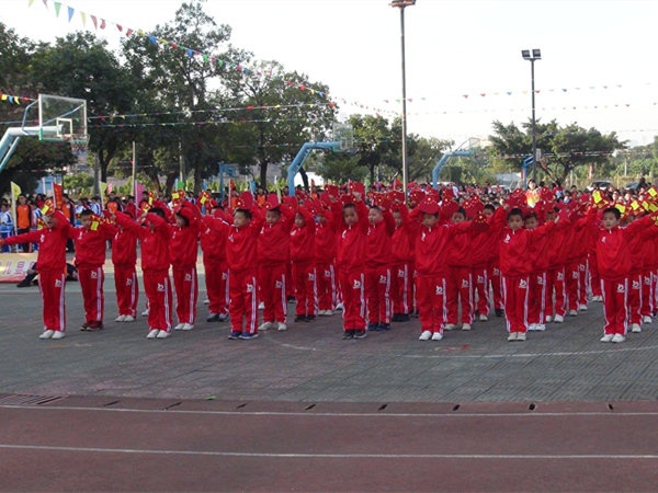 伴隨著《運動員進場曲》,學(xué)校國旗隊、校旗隊、大賽會徽、大賽口號、彩旗隊、鮮花隊、鼓號隊、各年級代表隊和裁判隊依次進場。入場儀式最精彩的是各年級學(xué)生代表組成的方隊入場,他們在進場儀式上進行了具有各級特色的入場式表演,有舞蹈、有體操、有古裝短劇······精彩的表演贏得了在場嘉賓和家長們的陣陣掌聲。進場儀式結(jié)束后,舉行了升旗儀式,隨著國旗的冉冉升起,全體師生激動萬分。隨后學(xué)校校長劉萬軒先生致開幕詞,這是學(xué)校在小欖鎮(zhèn)運動會取得優(yōu)異成績后舉行的一次盛會,希望各位運動員能繼續(xù)發(fā)揮小欖鎮(zhèn)運動會上的拼搏精神,秉著友誼第一比賽第二的精神賽出水平,展現(xiàn)出班級體的凝聚力,為班級爭光。接著裁判員彭雪紅老師、運動員代表徐金富同學(xué),分別代表裁判員、運動員宣誓。最后董事長陳添先生宣布東陽學(xué)校校第十三屆田徑運動會開幕,整個會場掌聲響起,把開幕式推向了高潮。開幕式結(jié)束后,學(xué)校舞蹈隊舞蹈表演了舞蹈《天使》、《與魚共舞》,把體育和藝術(shù)很好地結(jié)合在一起。