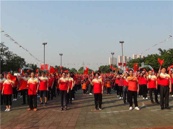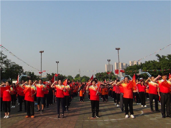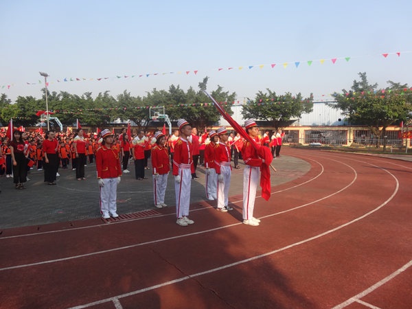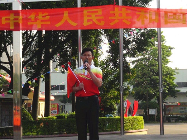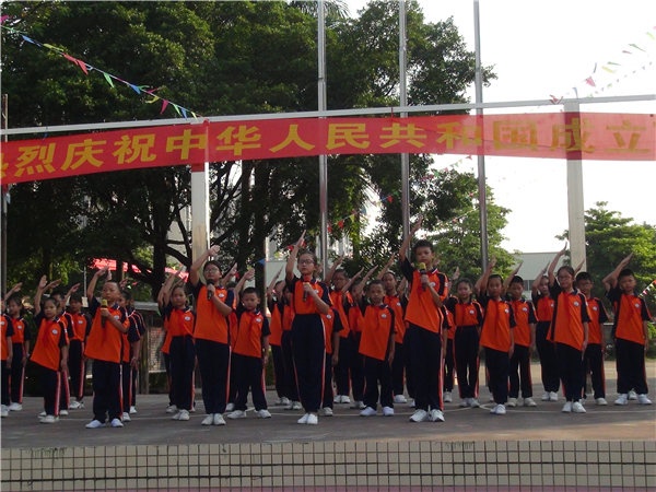 隨著國(guó)旗冉冉升起,全體師生莊嚴(yán)肅穆,在國(guó)旗下少先隊(duì)員敬禮,非少先隊(duì)員行注目禮。國(guó)旗迎風(fēng)飄揚(yáng),全體師生齊唱國(guó)歌,為祖國(guó)獻(xiàn)禮。緊接著劉萬(wàn)軒校長(zhǎng)在國(guó)旗下發(fā)表熱情洋溢的講話,祝愿祖國(guó)昌盛繁榮,希望同學(xué)們時(shí)刻把祖國(guó)放在心中。劉校長(zhǎng)演講完畢后,全體師生揮舞手中紅旗,在臺(tái)上同學(xué)領(lǐng)唱下齊唱《我和我的祖國(guó)》,禮贊新中國(guó)。接著全體師生在主持人的帶領(lǐng)下進(jìn)行呼號(hào),祖國(guó)萬(wàn)歲,祖國(guó)萬(wàn)歲,把自己對(duì)祖國(guó)的愛(ài)抒發(fā)出來(lái)。由學(xué)校朗誦隊(duì)朗誦《中華少年》,鏗鏘有力的朗誦,扣人心弦,震撼全場(chǎng)。最后由學(xué)校何信富、譚軍、劉秀、李莉老師為師生們帶來(lái)朗誦《我驕傲,我是中國(guó)人》,將整個(gè)慶?;顒?dòng)推向高潮。