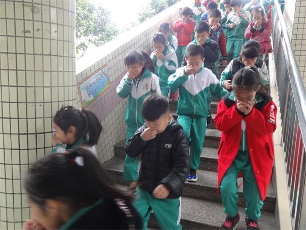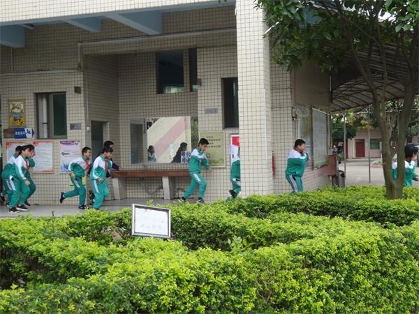 一陣急促的警報(bào)鈴聲響起,同學(xué)們們?cè)诎嘀魅卫蠋煹膸ьI(lǐng)下,迅速停止手中的一切活動(dòng),掩住口鼻,俯首彎腰,有秩序地按照學(xué)校之前預(yù)定的路線跑步撤離教學(xué)樓。到達(dá)操場(chǎng)后,班主任馬上整隊(duì)清點(diǎn)人數(shù),確保全班同學(xué)都到達(dá)指定地方“避險(xiǎn)”。除參與疏散指揮的各樓梯口的教師外,其余教師都按照應(yīng)急預(yù)案的要求,和學(xué)生同時(shí)到達(dá)操場(chǎng)。整個(gè)過程,同學(xué)們都保持沉著、冷靜的心態(tài),認(rèn)真嚴(yán)肅,不出現(xiàn)嘻哈打鬧現(xiàn)象,從教學(xué)樓五樓到學(xué)校大操場(chǎng),整個(gè)過程僅用了3分58秒時(shí)間,期間并沒出現(xiàn)任何安全問題。