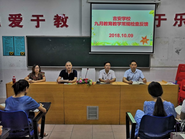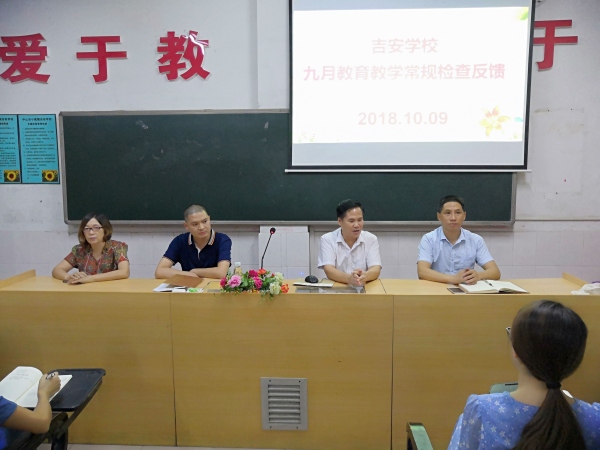 為強化教育教學常規(guī)管理,保證良好的教學秩序,確保教學常規(guī)穩(wěn)步推進,有效地提高教育教學質(zhì)量。10月9日晚上吉安學校在韋志海校長主持下召開了九月份的教育教學常規(guī)檢查反饋會議。