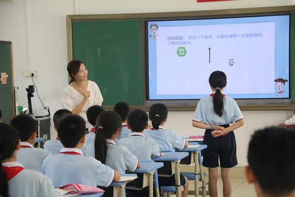 首先,胡柳老師和五(2)班學(xué)生上了一節(jié)《圖形的旋轉(zhuǎn)》。胡老師通過(guò)生活中的旋轉(zhuǎn)現(xiàn)象:例如鬧鐘的時(shí)針,風(fēng)扇、風(fēng)車(chē)的轉(zhuǎn)動(dòng),旋轉(zhuǎn)木馬的旋轉(zhuǎn)等等,引入新課——圖形的旋轉(zhuǎn)。課件上出示了一根指針和一只小熊,胡老師提問(wèn):“哪位同學(xué)能說(shuō)出明確的指令,使指針一下子指向小熊?”進(jìn)而引出旋轉(zhuǎn)的三要素,旋轉(zhuǎn)中心,旋轉(zhuǎn)方向,旋轉(zhuǎn)角度。課堂上學(xué)生踴躍回答,學(xué)習(xí)氣氛濃厚,語(yǔ)言表達(dá)也很清晰。整節(jié)課時(shí)間把握得當(dāng),教學(xué)環(huán)節(jié)設(shè)計(jì)合理,獲得了大部分老師的好評(píng)。