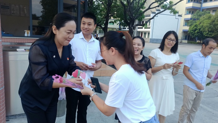 “三寸粉筆,三尺講臺系國運(yùn);一顆丹心,一生秉燭鑄民魂?!痹诘?6個(gè)教師節(jié)到來之際,聚星學(xué)校舉行了形式新穎、內(nèi)容豐富的慶?;顒?dòng),為辛勤的老師們送上了一份誠摯的祝福。一朵鮮花,一張校長親手書寫的賀卡,……這些小小的禮物是聚星學(xué)校給每一位老師的最溫馨的祝福。教師節(jié)這天一大早,黨支部書記、校長路海云,早已帶著幾位行政恭迎每位教師的到來。當(dāng)老師走到校門口的時(shí)候,校領(lǐng)導(dǎo)就把小禮品送到老師手上,并獻(xiàn)上最親切的祝福:“祝您教師節(jié)快樂!”,老師們欣喜地接過學(xué)校送來的祝福,臉上都洋溢著幸福的笑容。