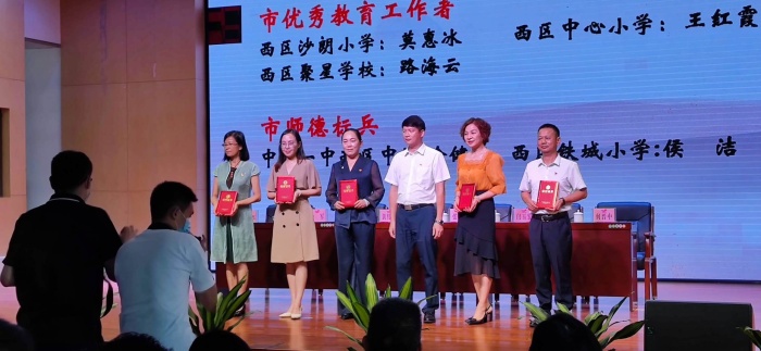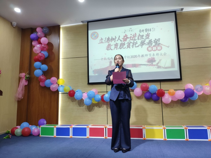 夜幕時分,華燈初上,聚星學校階梯室,處處洋溢著節(jié)日的氣氛。由七年級3班鐘欣怡同學和劉銦子老師主持的教師節(jié)表彰大會如期舉行。孩子們通過“演唱、詩歌朗誦、手語操表演、合唱”等形式,向老師們表達最真摯的謝意。路海云校長致辭,對辛勤工作的老師表達了真誠的問候和深深的祝福,勉勵老師們做新時代的四有教師,繼續(xù)全力以赴,再創(chuàng)佳績。會上,對2019--2020學年聚星學校榮獲市區(qū)優(yōu)秀的先進個人,聚星學校優(yōu)秀科組、優(yōu)秀教師、優(yōu)秀班主任進行了表彰。