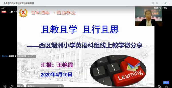 中山市教研室英語教研員張?zhí)﹦偫蠋熆隙藢W校科組線上教學所做的嘗試,探討了線上教學的有效做法,并指出了改進的方向。危機亦是契機,疫情是人生大課,雖然老師們不是抗疫在前線的最美逆行者,但卻用自己的方式和行動守土抗疫。通過此次培訓,西區(qū)煙洲小學英語科組的老師們意識到,作為一名老師,必須快速轉(zhuǎn)變教學理念,與時俱進,積極投入到學習、實踐和思考的過程之中去。通過“云端課堂”,確保線上教學的扎實有效。
