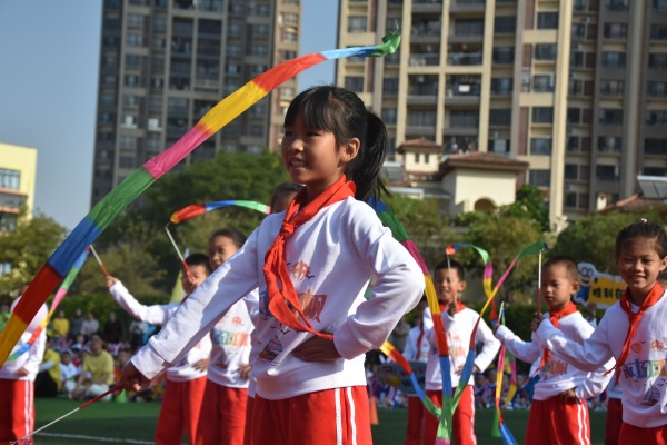 運(yùn)動(dòng)會(huì)開幕式在激昂的《運(yùn)動(dòng)員進(jìn)行曲》中拉開帷幕。威武莊嚴(yán)的國旗方陣緩緩經(jīng)過主席臺(tái),緊隨其后的是本屆運(yùn)動(dòng)會(huì)的會(huì)徽,接著便是最讓人期待的班級(jí)方陣。先是活潑可愛的一年級(jí)小朋友、古靈精怪的二年級(jí)……精神飽滿的五年級(jí),最后是英姿颯爽的廣豐小學(xué)啦啦操隊(duì)員表演?;蚴茄矍耙涣恋倪\(yùn)動(dòng)服,或是五彩繽紛的民族服裝,同學(xué)們使出渾身解數(shù)展示本班的風(fēng)采。口號(hào)嘹亮,響徹藍(lán)天,今年校運(yùn)會(huì)開幕式真是豐富多樣、精彩紛呈,有的腳踩輪滑,有的手中拿著球拍、有的腳踩著足球,彰顯多姿多彩的體育生活;有的街舞、中國舞、武術(shù)混搭,碰撞出不一樣的火花;有的讓五彩氫氣球升上天空,仿佛放飛了夢(mèng)想;有的請(qǐng)來家長(zhǎng)助陣,親子攜手更顯溫情;有的變換陣形,高舉形形色色的物件,借助圖像和呼喊表達(dá)自我……讓在場(chǎng)的師生和家長(zhǎng)沐浴在一場(chǎng)視聽文化盛宴中。