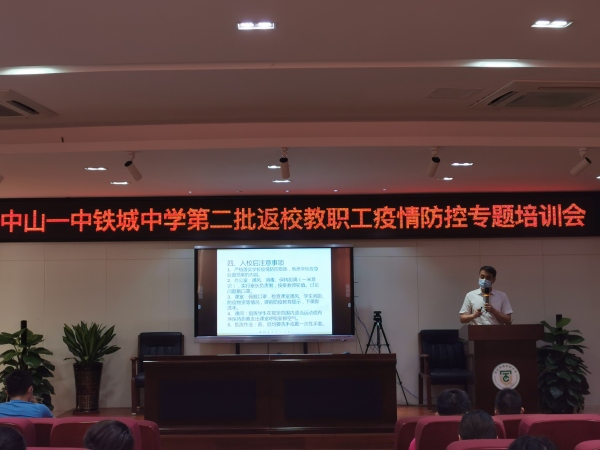疫情防控關(guān)系到每一位師生的安全,開學工作關(guān)系到千家萬戶的生活。隨著初三年級順利返校復學,中山一中鐵城中學按照省教育廳的文件精神,全體教職工團結(jié)一心,群策群力,于5月4日下午召開了初一、初二級全體教職工疫情防控專題培訓會議,積極落實防疫工作,精準做好初一、初二順利復學返校準備。